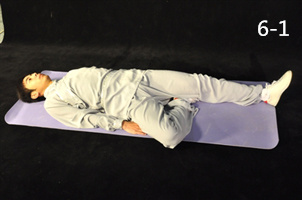 動(dòng)作1:接第三節(jié),從俯臥位轉(zhuǎn)至右側(cè)臥位,右手置于耳下,左手自然置于大腿側(cè)面(圖4-1)。