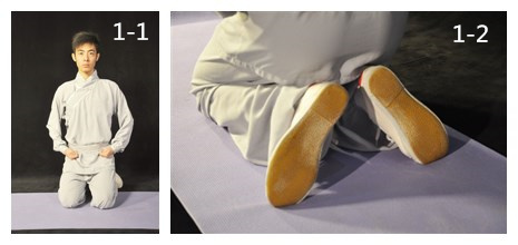 雙膝著席,足跟相對(duì),足趾向外,臀部坐于足跟上。上身保持正直,雙手握固。置于大腿根部(圖1-1、1-2)