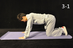 動(dòng)作1:接第二節(jié),雙手沿大腿及坐席,手貼坐席前推,引軀干前行,繼而伸膝,至大腿約略與坐具垂直,雙手與肩等寬,固著于席,與軀干約略垂直(3-1)