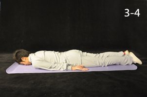 動(dòng)作3~4,反復(fù)操作3~5次,回至俯臥位,雙手松置體側(cè),掌心向上(圖3-4)。