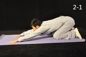 動(dòng)作2:雙手固定于席,用力前推,同時(shí)臀部盡力后坐(圖2-1)。
