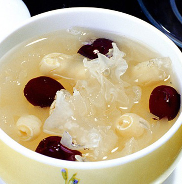 取銀耳二朵,櫻桃二兩,冰糖適量。銀耳用清水浸軟,櫻桃洗凈,去核;先將銀耳加水煮半小時,放入冰糖煮溶,最后加入櫻桃,煮片刻即可食用。