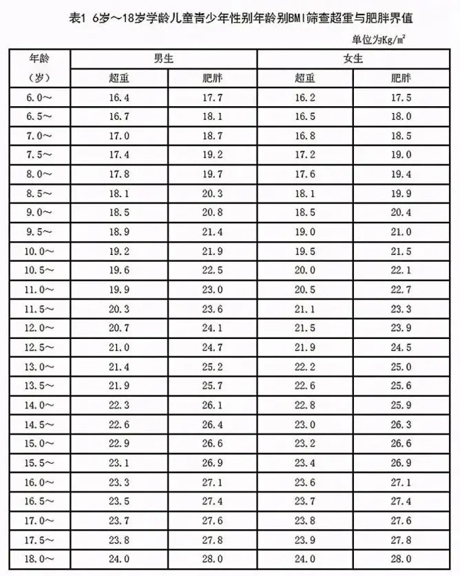 如何評(píng)估孩子胖不胖呢?世衛(wèi)組織建議使用的評(píng)估標(biāo)準(zhǔn):BMI(體重指數(shù))。體質(zhì)指數(shù)(body mass index)用于評(píng)估超重肥胖的指標(biāo)的計(jì)算公式:體質(zhì)指數(shù)(BMI)=體重(kg)÷身高^(guò)2(m)。例如:70kg÷(1.75mx1.75m)=22.86,然后根據(jù)自己的數(shù)值,對(duì)照下表。